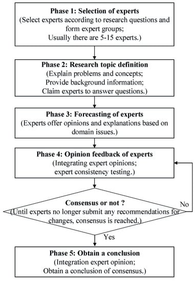 Here, represents the average value of item j and is the standard deviation. The larger the CDI is, the weaker the expert consensus is. In this paper, we used 0.1 as the basis for judgment of the CDI. Figure 1 shows the process of the Delphi method.