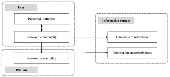 First, this paper identifies the key factors influencing diffusion behavior comparing with the literatures cited. Previous studies have found some influencing factors of diffusion behavior, such as user perception [35,36,37,38], platform perception [35,39,40], information content [26], social factors [12,24,30,41,42], and personal characteristics [10,13,43]. However, according to the empirical results, social factors and personal characteristics are no longer the main influencing factors in the context of emergency. Furthermore, according to the total influence matrix, social factors such as reputation seeking, altruism, moral perception, and emotional sharing have effects on information sharing, which is consistent with references [30,31,32,33], but not the key factors.