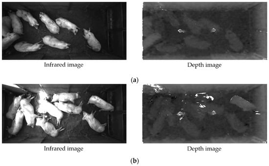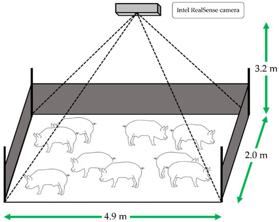 In the pig pen, a total of nine pigs (Duroc × Landrace × Yorkshire) were raised, with an average initial body weight (BW) of 92.5 ± 5.9 kg. We simultaneously obtained infrared and depth videos from the installed camera, which had a resolution of and 30 frames per second (FPS). Figure 8 displays the whole monitoring setup with the camera in the pig pen.