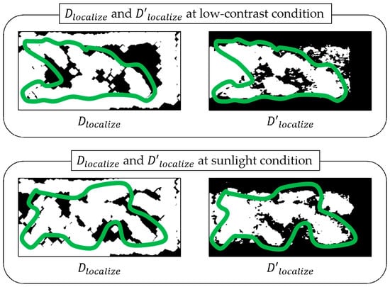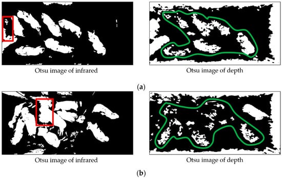 Every is applied with frame difference using the modeled and by applying histogram equalization and Otsu algorithm [47] on the image, a , where the pigs are localized with removing the wall, can be obtained. Applying the two localized images, and , to the infrared images allows for the robust detection of the pigs in the sunlight and low-contrast conditions. Figure 4 shows the results of localization for the pigs through the depth information in low-contrast and sunlight conditions, respectively. The missing pig-pixel problem could be solved effectively (compare the green areas shown in Figure 2 and Figure 4).