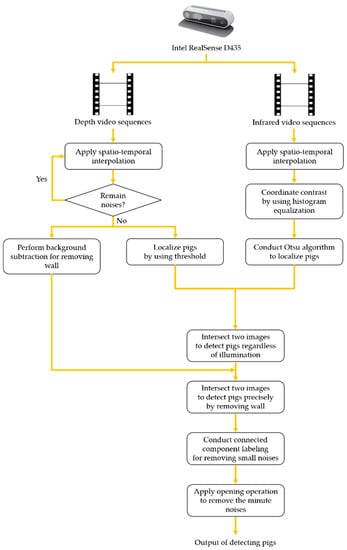 In this study, we propose not only a low cost but also a fast method to detect pigs through a top-view camera under various illumination conditions. First, we exploit the infrared and depth information which is concurrently obtained from a low-cost camera, such as Intel RealSense [43]. The accuracy of the depth information measured from the RealSense camera is degraded significantly when covering a large area (i.e., pig room). Furthermore, sunlight through a window at daytime generates many noises on both depth and infrared information. Thus, we integrate both information complementarily to resolve the low-pixel accuracy and illumination noises such as sunlight. Second, we apply simple but effective image processing techniques only for satisfying the real-time execution for pig detection. By decreasing the computational workload of the detection task through the simple image processing, it allows to complete intermediate-level vision tasks, such as pig tracking, and high-level vision tasks, such as behavior analysis for pigs.
