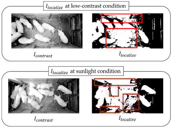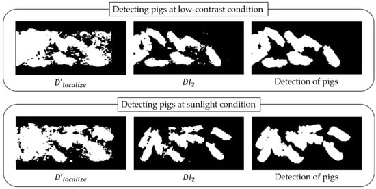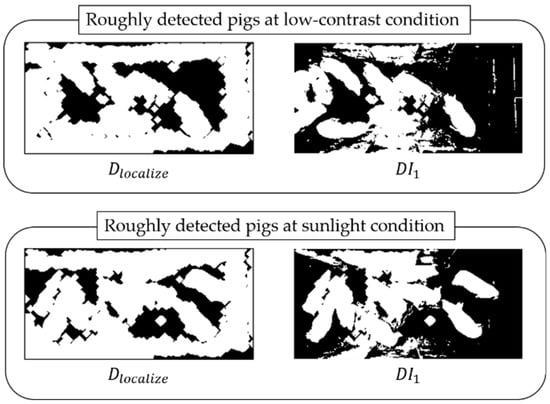 In the same way as the depth images, the ROI of is set in order to exclude the unnecessary region in the pen, and then the 4 × 4 spatiotemporal interpolation technique is performed for removing noises such as sunlight. Note that the spatiotemporal interpolation technique is performed only once, as the pixel values in are not correctly interpolated, owing to the characteristic sensitivity to illumination conditions. Then, the histogram equalization (HE) [46] is performed to resolve the low contrast of , which makes the contrast in consistent. Through the procedure of HE, the Otsu algorithm is applied to roughly localize the pigs in . Figure 5 shows the results of the localization of the pigs in gained from at low-contrast and sunlight conditions. However, the pigs in cannot be accurately detected because the contrast of all pixels in the floor, wall, and sunlight are also coordinated consistently by applying HE. That is, even though all the pigs in the pen can be confirmed, the noises are not totally removed. These noises can be removed by exploiting the complementary information from the infrared images (i.e., ) and depth images (i.e., and ) simultaneously.