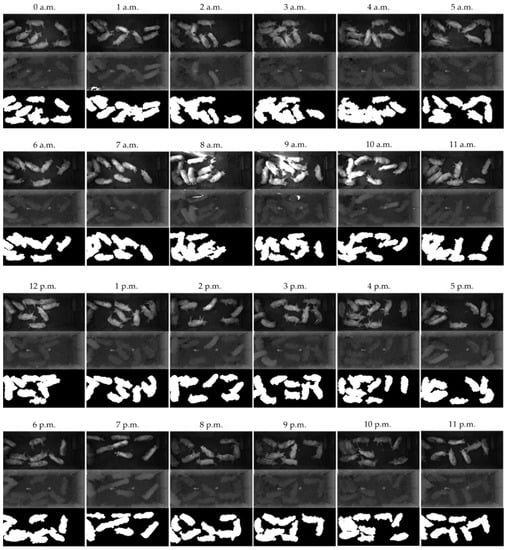 In the case of the procedure of depth information, a histogram analysis was performed to gain from . Here, the frequency of the depth value corresponding to the background converged to 53, and the threshold for segmenting the background was defined as 53. was then derived by binarizing , using the threshold defined through histogram analysis. In the second step, the frame difference between and was carried out to derive , where the Otsu algorithm was applied to . Note that because the parameter for localizing the pigs may be changed continuously according to the inaccurate depth values, the Otsu algorithm should be used to automatically determine the parameter for every image. In the case of the procedure of infrared information, could be obtained by applying HE to localize the pigs with . Similar to the procedure of the depth information, the Otsu algorithm was used to define the parameter for segmenting the background so that , where the pigs were localized, was obtained from with the Otsu algorithm. With the attributes from these procedures, and were obtained by intersecting among these localized images, where the noises resulted in the illumination conditions were removed. Finally, a morphology operation and CCA were conducted to as the post-processing steps for refining the detected pigs. As the size of each noise calculated by CCA was less than 100, the noises were simply removed with the threshold defined as 100. After that, a dilation operation was conducted three times to sufficiently recover the shape of the pigs, and as a result, all of the pigs in the pen could be accurately detected. Figure 9 illustrates the detected pigs by using the proposed method from the 24 h recorded videos. In Figure 9, only one detection result per hour is displayed because of the large number of the frames in the 24 h videos.