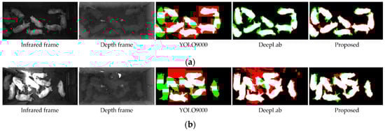 where true positive (TP) means a pixel on the pig predicted as the pig, false positive (FP) means a pixel on the background predicted as the pig, and false negative (FN) means a pixel on the pig predicted as the background, respectively. As shown in Figure 10, for example, we represented the false detected pixels for pigs (i.e., FP as false pig and FN as false background) as the red and green colors, respectively, from the results of each detection method. In the experimental results, the precision of each method was respectively measured as 0.79 (YOLO9000 method), 0.91 (DeepLab method), and 0.92 (proposed method). Also, the recall of each method was derived as 0.64 (YOLO9000 method), 0.88 (DeepLab method), and 0.86 (proposed method). Lastly, the detection accuracy (i.e., ACC) was measured as 0.54 (YOLO9000 method), 0.79 (DeepLab method), and 0.79 (proposed method), as shown in Table 3. By carefully fusing the depth and infrared information, the proposed method could also provide a higher accuracy than the deep learning-based methods.