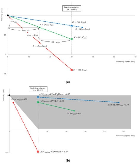 Then, we assume two hypotheses: first, the upper limit of with an unlimited computational resource (i.e., = 0) is 1 (see the black point at (0, 1) shown in Figure 11a); second, each computational step of method X contributes to the accuracy equally. In addition, the real-time criterion for a video stream application such as 24 h pig monitoring is set to 30 FPS (see the dashed line shown in Figure 11a). For the detection accuracy of method X at 30 FPS, we estimate the real-time accuracy of method X by using the two points (0, 1) and by using Equation (5) and (6):