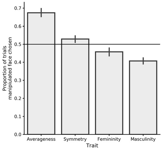 The results from this set of experiments replicate and extend previous research using the two-alternative forced choice paradigm. First, a preference for symmetrical face shapes was apparent. One of the aims of the current study is to quantify the size of factors of attractiveness, and for symmetry, this is not large (d = 0.30). Previous work examining symmetry in this way has found an effect, replicated here, but not focused on the actual size of that effect [20,45,81] which is small. Indeed, given the sensitivity of the forced choice paradigm, this interpretation casts further doubt on the relevance of symmetry in perceiving attractiveness aside from its evolutionary utility. However, this does not rule out symmetry as a useful predictor of attractiveness. For example, several meta-analyses report small effect sizes of symmetry and indicate this is to be expected, given the indirect nature of its measurement of developmental stability as an indirect measure of genetic quality [82,83,84].