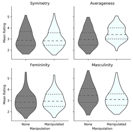 Ratings studies ameliorate many of these issues by providing a more naturalistic setting. In Study Two, another four studies are conducted, testing the effects of symmetry, averageness, and sexual dimorphism using the randomised presentation approach used by others to isolate specific effects without any carryover effects [73,74,75]. Rather than have the participants rate all the levels of the manipulation and, thus, risk comparison effects, the participants rate all the identities, but whether they see a manipulated version of the face or the original is determined randomly. Ratings can then be compared between conditions, using conventional statistical approaches as well as linear mixed models to account for the variance in faces and participants. It is worth noting that this is a conservative test in complete contrast to the two-alternative forced choice approach. If the evidence for the factors of attractiveness is robust, then the participants should be sensitive to the increased levels of symmetry, averageness, and dimorphism under these conditions. Given the experiment utilises manipulations, it is also possible to conclude the factors are genuinely affecting attractiveness, compared to correlational studies where other variables may influence a judgment.