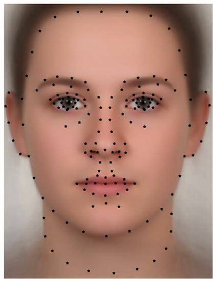 One hundred and nine females (age M = 20.54, SD = 2.26) posed as models. Each was photographed with a neutral expression, without cosmetics or facial jewellery, using a Canon EOS 5D Mark II camera with a Canon EF 24-105 mm lens (Canon, Ōta, Tokyo, Japan). All the camera settings were kept constant between exposures, including the ISO rating (100), lens aperture (F8.0), focal length (65 mm), and shutter speed (1/100). The models were compensated £6 for their participation. All the faces were manually delineated with a set of 160 points in JPsychomorph [44] to outline the facial appearance.
