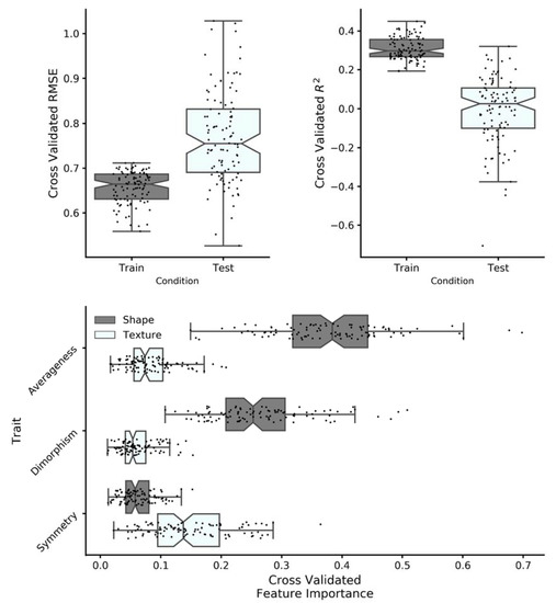 In this final study, the predictive utility of symmetry, averageness, and sexual dimorphism for facial attractiveness are assessed using novel analytical approaches from the field of machine learning. The three traits are measured directly from faces using geometric techniques common in biology [97] and anthropology [33], which use all available data from faces, rather than being constrained by a select few landmarks or skin regions that is typical in the literature [15,22,98]. These approaches can also negate the limitations the manipulation approach has: For example, symmetrising faces removes both fluctuating and directional asymmetries. A random forest regressor [99] is applied to these predictors, which is capable of a high predictive accuracy as well as capturing the complex nonlinear patterns and interactions in data. These models also provide a useful metric of “feature importance”—a weight similar to a regression beta value that gives the importance of a particular predictor in making decisions about the outcome. This analysis will provide evidence of both the predictive power of the long-standing theoretical approaches in attractiveness research as well the relative importance of the factors in predicting attractiveness that may mesh with the experimental evidence above through the use of “bottom up” approaches in terms of feature measurement and modelling.