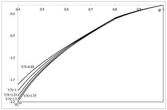 Variation of the residual radial stress with ρ in an a = 0.4 cylinder at several values of Y/X.