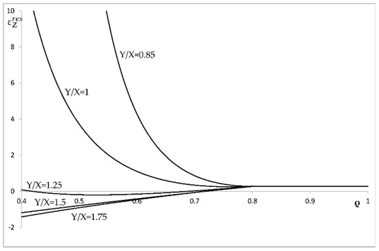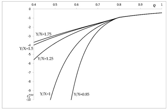 Variation of the residual axial strain with ρ in an a = 0.4 cylinder at several values of Y/X.