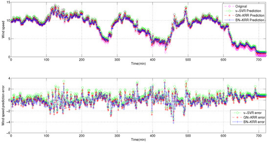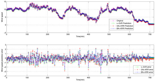 Suppose the training sample number is 2160 (from 1 to 2160 for 15 days), and the number of test samples is 720 (from 2161 to 2880 for 5 days). The input vector is , the output value is , and . Namely, the pattern above is used to forecast the wind speed each interval of 10 and 30 min at each Point , respectively [30,31].