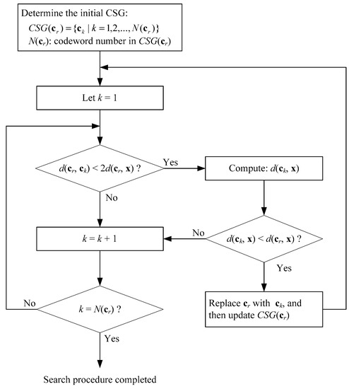 | Step 5. If (d(ck, x) < d(cr, x)), then replace cr with ck, update new CSG(cr), let k = 1, and repeat Step 3. |