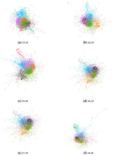 In this paper, six versions of Ubuntu Kylin operating system software dependency network are portrayed in our experiments. As a Chinese distribution of Ubuntu, distributor released their first distribution by 2013. From then on, six stable versions were produced. Thus, experiments of extracting package dependency network is conducted from official versions of 13–18. However, as time goes by, quantity and variety of installed software packages differ from one user to another on account of their own using habits. Therefore, all of our experiments are accomplished by using the original version of the system, videlicet, the original released version. Figure 1 summarizes holistic structures of six operating system software package dependency networks. Gpephi, which is an open-source tool, was utilized to realize visualization of all networks. All networks in Figure 1 are demonstrated in modularity and each color represents a unique module. Nodes inside a module are highly connected with each other while there are few connections among modules.