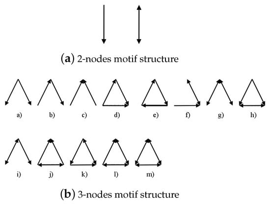 A connected graph is a graph in which nodes can reach each other. Theoretically, there are at most two kinds of relations between two nodes in a directed network, while three nodes can form 13 different connections. The connected subgraph of two nodes and three nodes are shown in Figure 2.