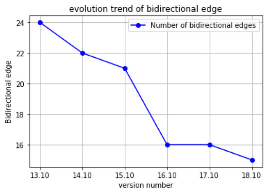 As can be observed in the above six tables, motifs in the software package dependency networks of Ubuntu Kylin operating system have been relatively stable during version evolution process. Each version has four network motifs of the same type. Except version 17.10, four motifs of other versions seem to be of similar importance. It can be discovered from these motifs that the internal connection of the module also presents the phenomenon of preferred choice. Stable evolution of motifs demonstrates a robustness and stability of Ubuntu Kylin operating system evolution. However, through the estimation of motif mining, it is revealed that connected subgraphs with ring topology exist with a relatively higher proportion of 50%. Even the Z-score of these motifs in some versions are very high. It can be seen from the above description that the larger Z-score is, the more important the motif is in the network. Since ring structure in a network predicts a lower stability of the network, for the sake of improving system complexity and readability, loops should be prevented. Thus, developers must pay attention to the software packages that generate loops in the distribution. Figure 4 depicts the number of bidirectional edges in the evolution of Ubuntu Kylin operating system.