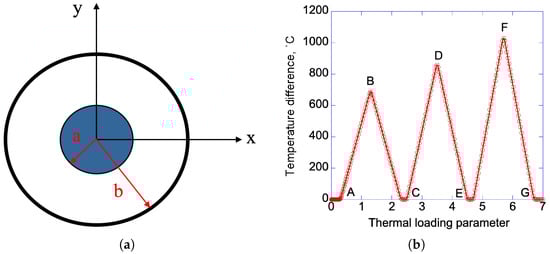 As shown in Figure 1a, the composite cylinder consists of an isotropic, purely elastic inclusion and elastoplastic matrix with the orthotropic symmetry both in its elastic and plastic behavior. The inclusion-matrix interface is assumed to be perfectly bonded. The outer boundary of the composite cylinder is fully clamped, and a uniform temperature field is quasi-statically applied to the composite cylinder. Figure 1b shows representative thermal loading cycles. The thermal loading parameter serves as loading steps in our analysis. In the figure, at Points B, D and F is in ratio of 1:1.25:1.5. The temperature differences at the three points are 700, 875 and 1050 C, respectively. During the thermal loading or unloading cycles, residual stress fields may be developed at Points C, E and G. The physical properties of the isotropic elastic inclusion (Young’s modulus GPa, Poisson’s ratio , linear thermal expansion coefficient K) are assumed to be temperature independent, but those of the elastoplastic matrix are temperature dependent. Physically it is envisioned that the inclusion is made of a ceramic material (), surrounded by metallic material (), where r is the radial component of the polar coordinate system to describe the points in the domain. The elastoplastic problems are numerically analyzed via the finite element method in two dimensions.