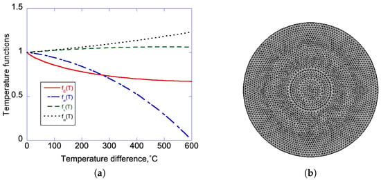 where the applied temperature difference T is in units of C and reference temperature is 22 C. A graphical representation of the temperature functions is shown in Figure 2. For the case that the material is elastically and plastically isotropic, at the reference temperature, the Young’s modulus, yield stress, Poisson’s ratio and linear thermal expansion coefficient of the matrix material are assumed to be GPa, MPa, , and per C, respectively. When the material is orthotropic, the above-mentioned temperature functions are applied to the material parameters at the reference temperature, listed after Equation (1). In other words, temperature-dependent yield stress , Young’s modulus , Poisson’s ratio and linear thermal expansion coefficient . This choice of material parameters is representative for studying the temperature dependent elastoplastic materials in general. The deformation process is assumed to be quasi-static throughout this work.