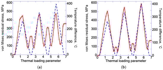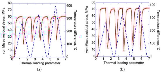Von Mises residual stress at m in the temperature-dependent (TD) case with the polar angle (a) and (b) . Dashed lines indicate the applied temperature difference.