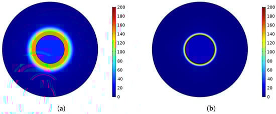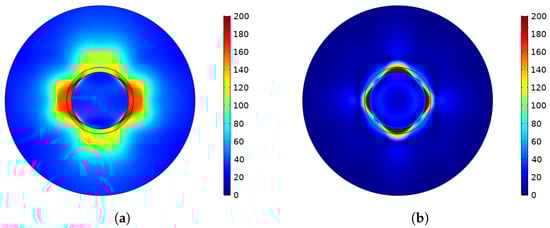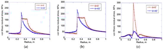 In the previous section, the results are obtained with all material properties being temperature dependent. In this section, we examine the effects of selective TD material properties on residual stress. Linear hardening with MPa is assumed and its temperature dependence is assumed to be . Figure 5a shows the residual stress in the orthotropic cylinder after the maximum temperature difference 400 C loading with all material parameters being temperature dependent, i.e., the four temperature functions listed in Equations (20)–(23) are used in the analysis. When only yield stress is considered to be temperature dependent, the corresponding residual stress is shown in Figure 5b. As can be seen their von Mises residual stress distributions are similar, but their magnitudes are distinct. Furthermore, the range for the residual stress ‘plateau’ is shorter when all material properties are temperature dependent. The ‘plateau’ is slightly inclined due to the small linear hardening . As for comparisons, the residual stress distribution for the TI case is shown in Figure 5c. Due to no reduction in yield stress in the TI case as temperature increases, sharp residual stress distribution is developed near the inclusion-matrix interface. It is remarked that residual stresses are self-equilibrated inside the material. However, the von Mises residual stresses do not show this trend since they have averaged according to Equation (19).