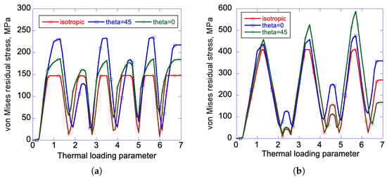 The development of residual stresses in materials depend on a variety of variables []. If the residual stresses are to be minimized for certain applications, suitable selection of materials and boundary conditions, as well as the methodology of analyzing the residual stresses under given conditions, need to be considered. From the present study, to avoid complex residual stress developments in the TD case under thermal loading, one may consider to choose a material with less anisotropy and temperature sensitivity. For the TI case, one may either choose more isotropic material or use multiple layers near the interface to reduce the orientational dependence in residual stress. The multiple layers with suitable design and material selections may reduce the stress in the matrix, hence reduce yielding and consequent the developments of residual stresses after unloading. The multiple layer method may also work for the TD case. Further analysis is required.