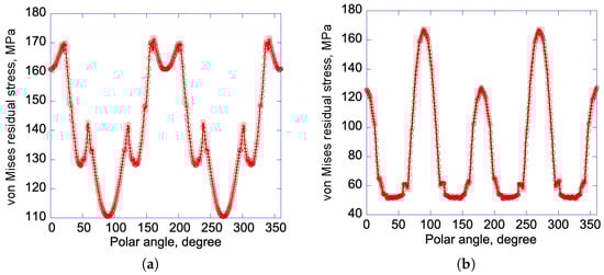 Von Mises residual stress at m around the polar angle in the orthotropic cylinder for the (a) TD and (b) TI case.