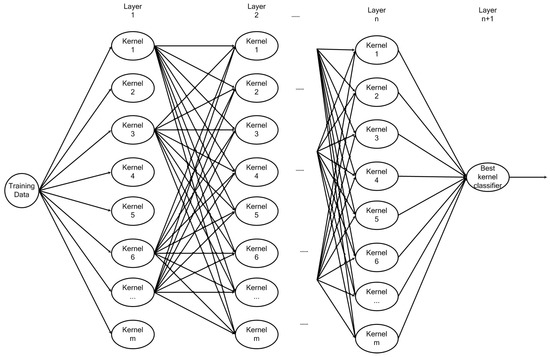 According to Algorithm 1, each iteration from step 4 to step 17 builds one layer of the SA-DMKL architecture. In Algorithm 1, i stands for layer number, and j records the number of layers while remains the same. Step 5 to step 6 train m SVMs. In step 8, is calculated by tth kernel function with input data D, which is used in the next layer. In each iteration, the accuracy performance is evaluated for each support vector machine (SVM). If the best accuracy does not change in fixed iterations, the iteration should be stopped. Furthermore, the corresponding kernel of the SVM is discarded if its generalization bound is higher than the threshold value within step 10 to step 14.