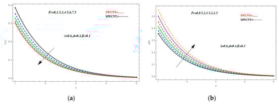 The influences of inertia coefficient on , , , and Prandtl number on are shown in Figure 4a–d. Figure 4a shows the inertia coefficient on . It is observed that greater values of inertia coefficients resulted in the decline of . Figure 4b depicts the effect of inertia coefficient over the velocity field For greater inertia coefficients of SWCNTs and MWCNTs, there is an increase in the velocity field The influence of the inertia constant on is shown in Figure 4c. Greater rates of inertia factor resulted in powerful temperature field and additional thermal layer thicknesses for SWCNTs and MWCNTs. Figure 4d shows that greater Prandtl number resulted in the decline of the temperature field of SWCNTs and MWCNTs.