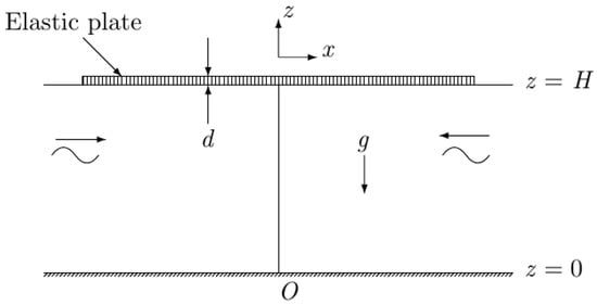 In the past few years, various theoretical and numerical studies have been presented with the help of the Kirchhoff–Love plate theory to examine hydroelastic wave problems. For instance, Xia and Shen [] analyzed the nonlinear interaction between hydroelastic solitary waves covered with ice. They used a simple perturbation method to obtain the solution for the nonlinear equations. They found that the wavelength, shape and celerity of nonlinear solitary waves depend on the wave amplitude. The wave speed is less than the wave speed in an open water region. Milewski et al. [] discussed hydroelastic waves in deep water using a numerical method. They used a nonlinear model for an elastic plate and particularly discussed the dynamics of unforced and forced waves. Vanden–Broeck and Părău [] investigated the generalized form of hydroelastic periodic and solitary waves in a two-dimensional channel. They derived weakly nonlinear solutions using a perturbation scheme, and fully nonlinear solutions were obtained with the help of a numerical method. Deike et al. [] experimentally examined the behavior of nonlinear and linear waves propagating beneath an elastic sheet in the presence of flexural waves and surface tension. By using an optical method to derive a full space–time wave field, Deike et al. [] observed that nonlinear shift occurs due to tension in a sheet by transverse motion of the fundamental mode of an elastic plate. They further noticed that the separation between associated timescales is satisfactory at each scale of a turbulent cascade which coincides with theoretical results. Wang and Lu [] studied nonlinear hydroelastic waves traveling under an infinite elastic plate on the surface of deep water through the homotopy analysis method.