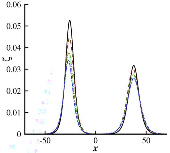 Head-on collision between two solitary waves for different values of . Solid line: ; dashed line: ; dot-dashed line: ; dot-dot-dashed line: .