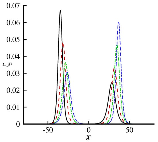 Head-on collision between two solitary waves for different values of and . Solid line: , ; dashed line: , ; dot-dashed line: , ; dot-dot-dashed line: , .