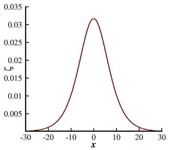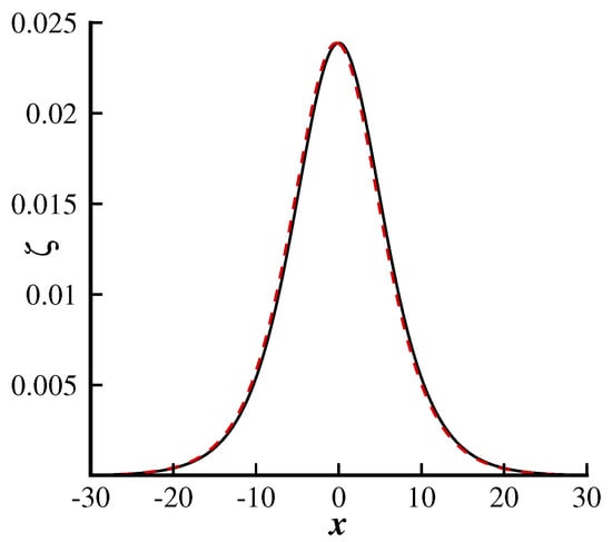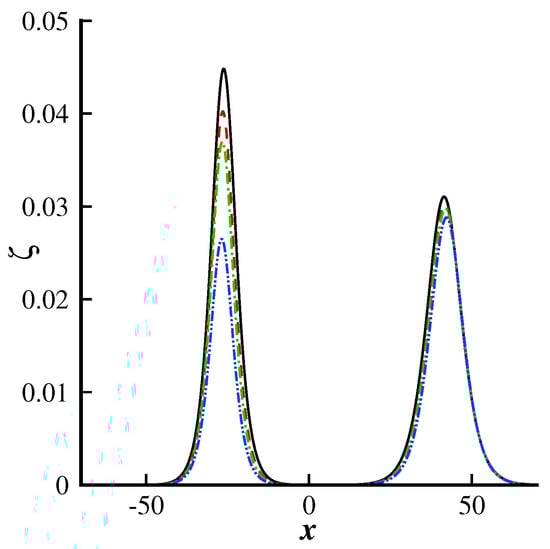 Figure 2 shows the wave profile for different values of and . When the effects of the elastic plate are taken into account, then significantly changes in the wave profile are observed. The parameter is directly proportional to the plate thickness d and Young’s modulus E. When and increase, the plate becomes significantly stiffer, which produces a reactive force that opposes the deformation of hydroelastic waves. Figure 3 is plotted to see the effect of the current on the solitary wave profile. We can see from this figure that when the current is moving from right to left, ; then, the wavelength, amplitude and speed of the solitary waves are affected as shown in the region . However, when , a similar and converse behavior is found for the second solitary waves in the region . Figure 4 shows that an increment in the surface tension parameter significantly diminishes the wave profile and that the wave profile before and after the collision process becomes narrower as the surface tension increases. Figure 5 shows a graphical comparison with previously published results presented by Su and Mirie []. We can observe that when , , , and , our results are in excellent agreement with those of Su and Mirie [] for pure gravity waves, which ensures the validity of the present results and the methodology used.