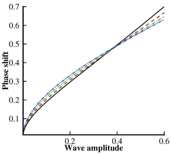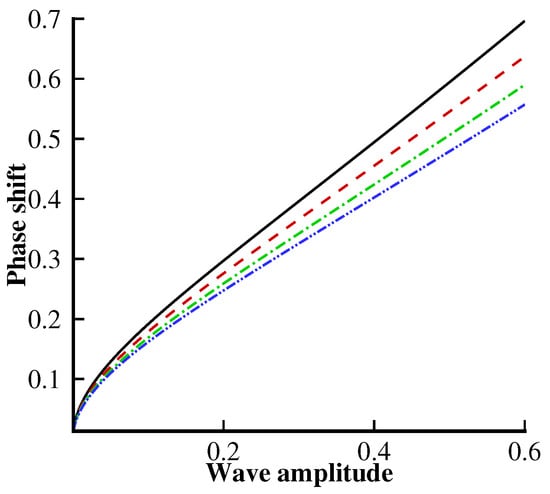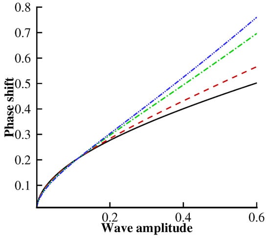 Phase shift wave amplitude. Solid line: , ; dashed line: , ; dot-dashed line: , ; dot-dot-dashed line: , .