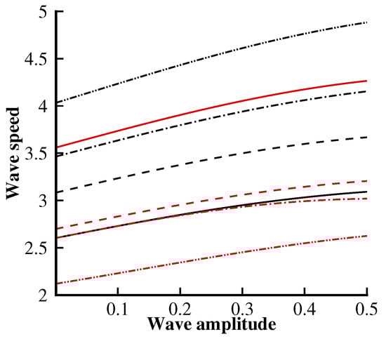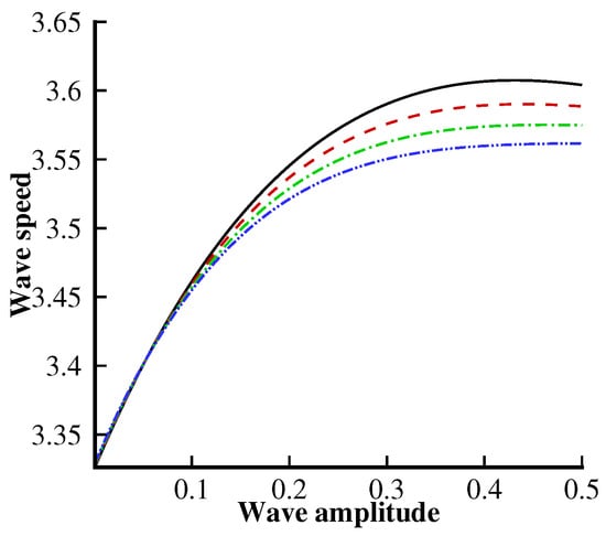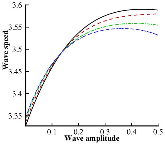 Wave speed wave amplitude. Solid line: ; dashed line: ; dot-dashed line: ; dot-dot-dashed line: .
