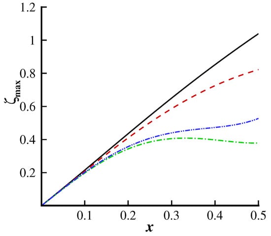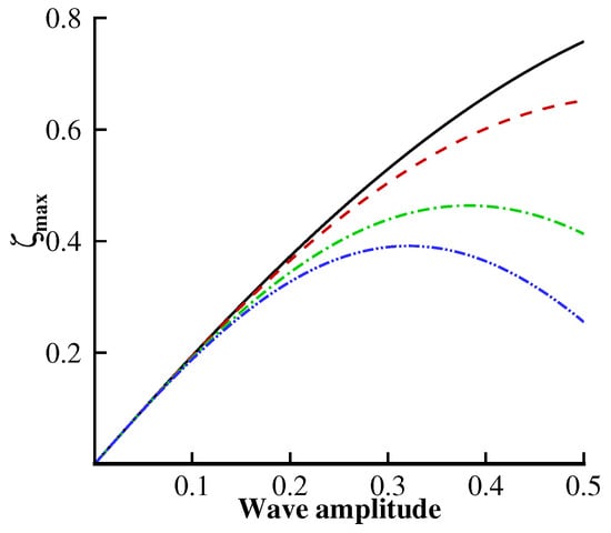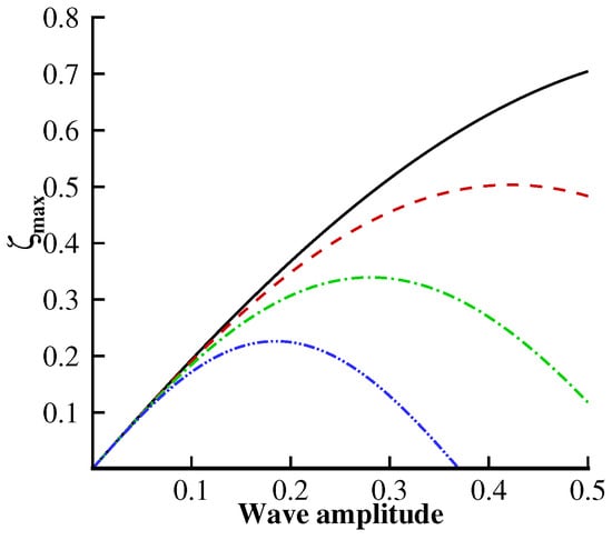 Maximum run-up wave amplitude. Solid line: ; dashed line: ; dot-dashed line: ; dot-dot-dashed line: .