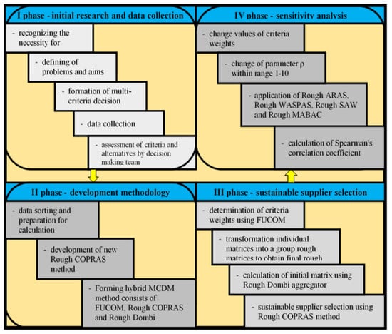The first phase consists of five steps. First, recognition of the need for this research and definition of the problems and aims of the research are performed in the first two steps, and the MCDM model is formed in the third step. After forming the model and defining all elements, the criteria, the alternatives, and the team of experts, the processes of data collection begins, which is the fourth step of the first phase. In the last step, the evaluation of the mutual significance of the criteria and evaluation of the alternatives by the formed team of experts are carried out. The second phase consists of three steps, where the first one is collected data sorting and preparation for their insertion into the developed model. The second step is the development and detailed description of the rough COPRAS method, and the creation of a hybrid MCDM model in the last step of this phase.