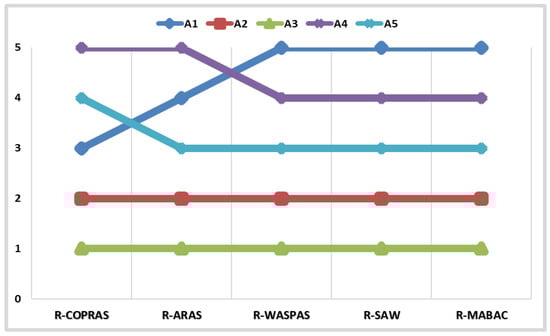 Figure 3 shows the comparison of the proposed model with other approaches developed recently: rough WASPAS [], rough MABAC [], rough SAW [], and rough ARAS [].