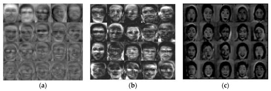 Figure 2a–d shows visual images of the base matrices obtained from the training samples based on the PCA, threshold SNMF, CNMF, Multi-layer NMF and the new additive iterative SWNMF method, respectively. Since the initial values of U and V are random values between 0 and 1, the threshold is set as a value between 0 and 1. Usually, the threshold is smaller, the more redundant information can be eliminated, and the data are more centralized. Here, the threshold is set to 0.01.
