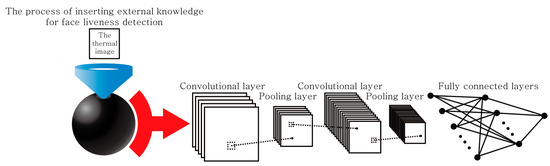 First, knowledge is inserted for face liveness detection. After that, the data with external knowledge is calculated in the convolutional layer and transferred to the pooling layer. This can be repeated several times in order to process the complex image. Next, CNN passes the previously obtained information to the fully connected layer. Finally, CNN classifies the image in the output layer. The process of inserting external knowledge, the convolutional layer, the pooling layer, and fully connected layer are explained as the paper continues. The process of inserting external knowledge for face liveness detection can be accomplished by the process of inserting knowledge about the temperature that a human face can have. This can be represented as Equation (1).