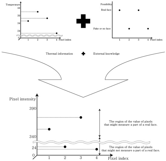 In the graph shown in the upper left of Figure 2, the vertical axis represents the temperature values. In the graph shown in the upper right of Figure 2, the external knowledge about the possibility that a part of an object measured by each pixel is a part of a real face and the possibility that it is not is expressed. Note that there are no quantitative values in the vertical axis shown in the upper right graph in Figure 2. All of the graphs of the horizontal axes shown in Figure 2 represent the pixel index. In the upper left graph in Figure 2, pixels 2 and 3 are data with different meanings from the graph on the upper right, but there is almost no quantitative difference. In order to emphasize this content, input data must be re-expressed so that there are distinct differences between the two different data: one might measure a part of a real face, and the other might not. To do so, knowledge value in Equation (1) is used. As shown in the graph in Figure 2, below, information is forced to be distributed in a specific region through a considerable difference between real values, and thermal information about the temperature value of the pixels measured is also expressed showing a minute difference. The differences in measured temperatures can be seen by comparing pixel 1 to pixel 3 and pixel 2 to pixel 4. The optimal knowledge value can be empirically found through experimentation.