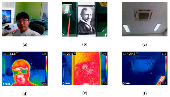 Figure 3a,d are RGB and thermal images with a real face present, respectively. Figure 3b,e are RGB and thermal images with a face on a display, respectively. Figure 3c,f shows images taken of a ceiling air conditioner with no face. In the thermal images, the color is obtained by the software in the thermal camera itself so that the measured temperature can be intuitively grasped visually. In Figure 3a,b,d,e, it can be seen that the outline of the heat distribution and the heat on the face from the display differ from those of the real face. The RGB face liveness detection dataset jongwoo (RFLDDJ) we created and the thermal face liveness detection dataset jongwoo (TFLDDJ) we created are available on the internet. In NUAA [8], the whole picture is completely filled with faces. However, in the RGB dataset we created, people and objects were shot in indoor living environments in order to increase the level of difficulty. In other words, multiple objects coexist in a single image in the datasets we made. The data are more difficult because a more general situation is assumed. The information of the datasets can be found at websites listed in the Supplementary Materials at the end of this paper.