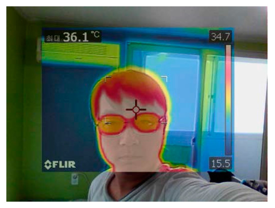 The Flir C3 was used as the camera for collecting data. The camera has two lenses on the front: an RGB lens to obtain RGB images of 640 × 480 pixels and an infrared lens to obtain thermal images of 80 × 60 pixels. The information on the Flir C3 can be found at a website listed in Supplementary Materials at the end of this paper. We collected one RGB image and one thermal image in each scene to find suitable data for face liveness detection. Since a thermal image is better than an RGB image at night, we took images in indoor residential environments with visible light for accurate performance comparison. There were no conditions for the distance of the object. The faces in the dataset were used with and without a variety of accessories, such as glasses. No matter what, the face is covered by any object, which can cover anything except the eyes, nose, and mouth. We used the function of the Flir C3 that allows for the simultaneous operation of the two lenses. A total of 844 scenes were taken. The actual data used were 844 Excel files with temperature information collected from infrared lens and 2532 Excel files with R, G, and B information collected from RGB lens. In Figure 3, the images in the top row are RGB images, while the images in the bottom row are thermal images.