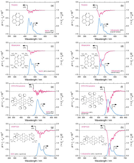 Figure 1a–j display comparisons of the CPL/PL (photoluminescence) spectra of perylene and five derivatives in alcoholic solvents and chloroform at room temperature.