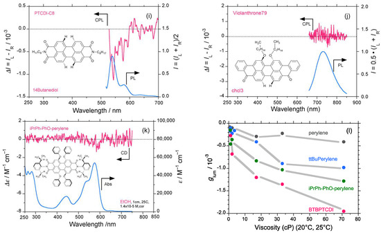 Comparison of circularly polarized luminescence/photoluminescence (CPL/PL) and circular dichroism (CD)/ultraviolet (UV)–visible spectra of perylene and five derivatives in alcoholic solvents at room temperature (path length: 10 mm, cylindrical cuvette, concentration 1–2 × 10−5 M. CPL/PL spectra of perylene excited at 390 nm in (a) methanol, and (b) 1,4-butanediol. CPL/PL spectra of ttBuperylene excited at 395 nm in (c) methanol, and (d) 1,4-butanediol. CPL/PL spectra of iPrPh-PhO-perylene excited at 470 nm in (e) methanol, and (f) 1,4-butanediol. CPL/PL spectra of BTBPTCDI excited at 525 nm in (g) methanol, and (h) 1,4-butanediol. (i) CPL/PL spectra of PTCDI-C8 excited at 490 nm in 1,4-butanediol. (j) CPL/PL spectra of Violanthrone 79 excited at 625 nm in chloroform. (k) CD/UV–visible spectra of iPrPh-PhO-perylene in methanol. (l) The glum value of perylene, ttBuperylene, iPrPh-PhO-perylene, and BTBPTCDI as a function of solvent viscosity.