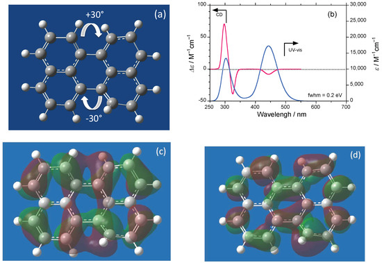 (a) Hypothetical model of perylene twisted by 30°; (b) simulated CD/UV–visible spectra with 0.2 eV full width at half maximum (fwhm) and electron density mapping at (c) first lowest unoccupied molecular orbital (1st LUMO) and (d) first highest occupied molecular orbital (1st HOMO). For this time dependent density functional theory (TD-DFT) and Becke, three-parameter, Lee-Yang-Parr exchange-correlation functional (B3LYP) with 6-31G(d) basis set, Gaussian09 rev D.01 (GaussView5 package)-calculated structures, a closed-chiral-loop current (red) is obvious for the LUMO, although this is not the case for the HOMO.
