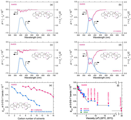 CPL/PL spectra of bis-MSB (trans-p-phenylenevinylene-type scintillator) in (a) methanol, (b) n-undecanol, (c) n-pentane, and (d) squalane (path length: 10 mm, cylindrical cuvette, concentration 2.5–10 × 10−5 M); (e) glum value of bis-MSB as a function of carbon number in two series of n-alkanes and n-alkanols (including methanol and ethanol); (f) glum value of bis-MSB as a function of solvent viscosity (η = 0–30 cP).