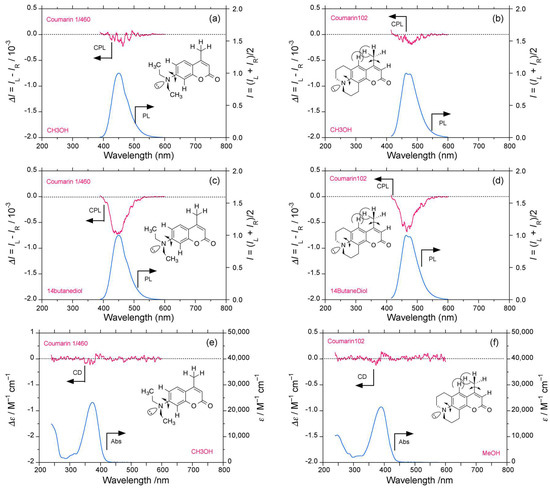 Comparisons of CPL/PL and UV–visible spectra of coumarin 1/460 and coumarin 102 at room temperature (path length: 10 mm, cylindrical cuvette, concentration 2.5–10 × 10−5 M. CPL/PL spectra of coumarin 1/460 in (a) methanol (excited at 365 nm), and (c) 1,4-butanediol (excited at 365 nm). CPL/PL spectra of coumarin 102 in (b) methanol (excited at 380 nm), and (d) 1,4-butanediol (excited at 380 nm). UV–visible spectra of: (e) coumarin 1/460, and (f) coumarin 102 in methanol.