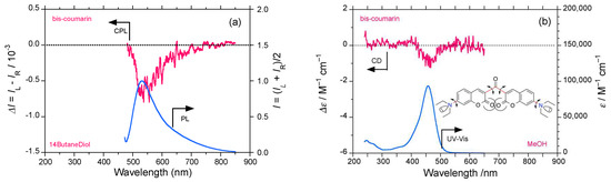 Finally, we checked the CPL/PL and CD/UV–visible spectra of 3,3′-carbonylbis(7-diethylamino- coumarin) (bis-coumarin). As a result, bis-coumarin in 1,4-butanediol showed clear but broader (−)-sign CPL signals with glum = −0.65 × 10−3 at 531 nm (Figure 15a) and a clearly associated (−)-sign CD signal with gabs = −1.0 × 10−5 at 463 nm (Figure 15b).