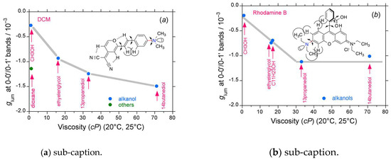 Comparison of glum values of (a) DCM and (b) RhB as a function of solvent viscosity at room temperature (path length: 10 mm, cylindrical cuvette, concentration (2.5–10) × 10−5 M.