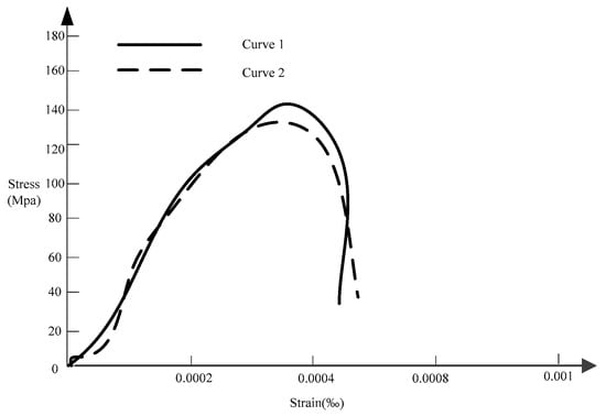The unit shown in Figure 3 is calculated with the proposed model after standard training. The load curve is shown in Figure 4. The matrix strength of the material is 100 MPa and the content of steel fiber is 6%. The input parameters are Mpa, , and . The results of the calculation are shown in Figure 6. The curve 1 is the curve obtained by eliminating the time variable from the stress-time curve and the strain-time curve of the element. The curve 2 is obtained with the input of the historical information of stress, strain, and strain rate of the element. From Figure 6, it can be seen that the two curves are closer, which shows that the proposed model is feasible and effective in the finite element calculation process.